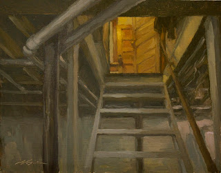 This one I painted last night. It is the view looking down into our basement. It was really kind of tricky since I was backed up to a wall so I couldn't step back while painting and was working under an incandescent bulb. So...I didn't quite know what I'd end up with as far as color and perspective. Looking at it now, there are some things I could change and still might. 14x11, oil.